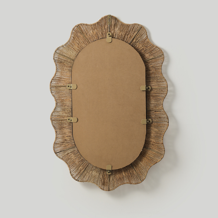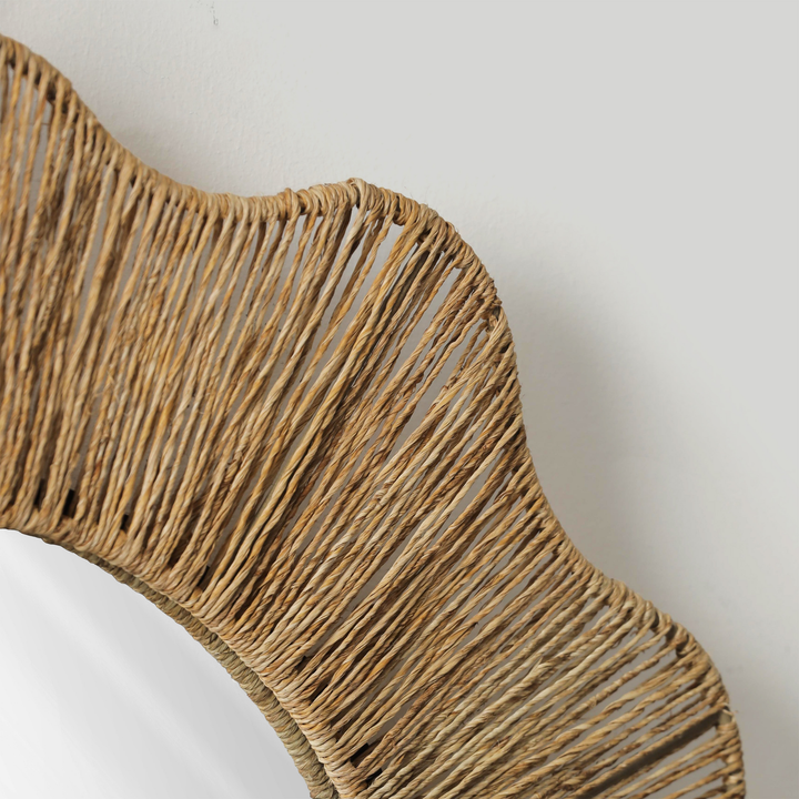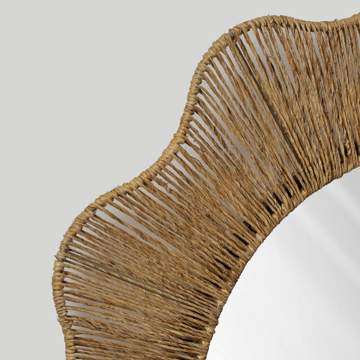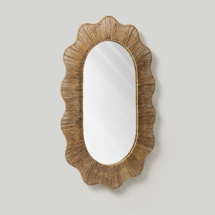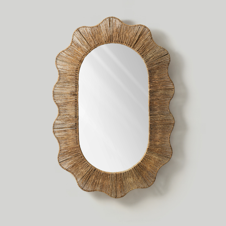 Transform your walls into a sophisticated gallery with this exquisite handwoven oval mirror that marries vintage charm with modern elegance. Master artisans wrap golden natural fibers into flowing, wave-like scallops that ripple around the elongated oval glass, creating a piece that feels both timeless and fresh. The undulating frame catches light at every curve, casting delicate shadows that shift and dance throughout the day like gentle water ripples frozen in time.