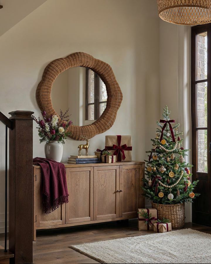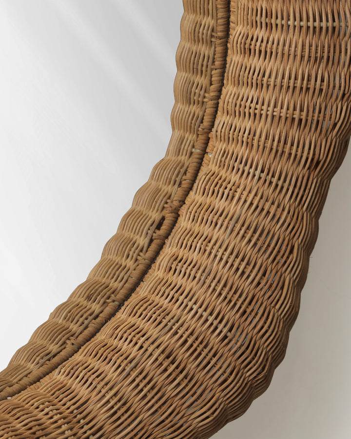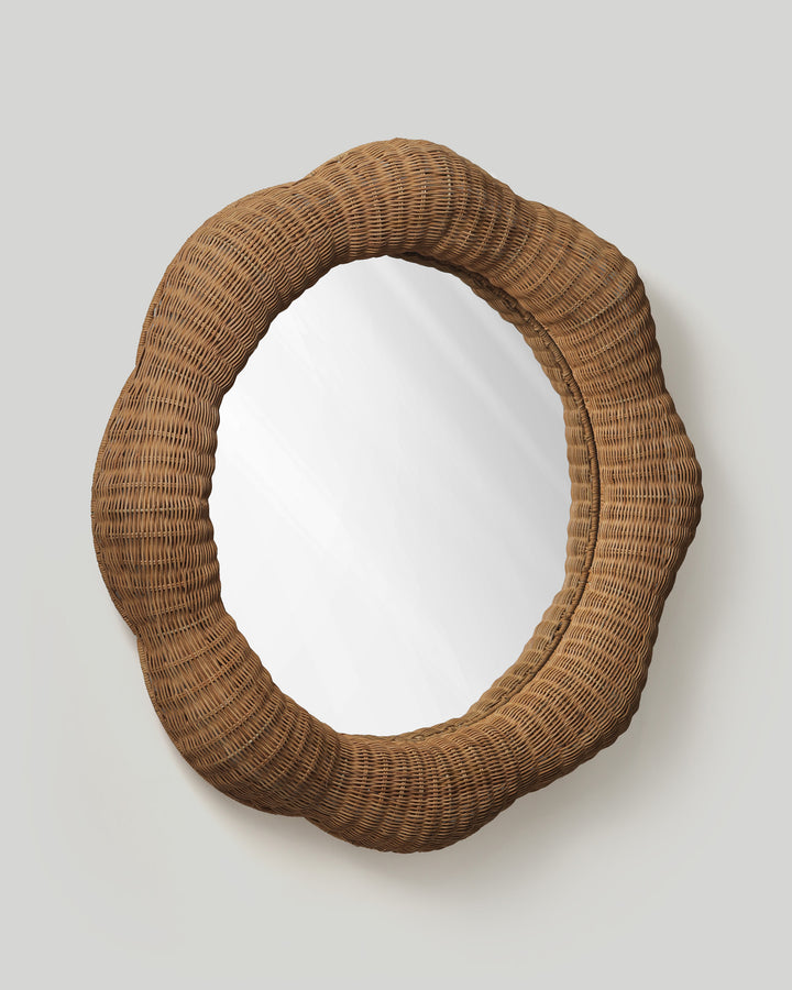 Transform your walls into a gallery-worthy display with this extraordinary handwoven rattan mirror that breaks every rule about traditional frames. Skilled Vietnamese artisans shape and weave golden rattan into soft, cloud-like scallops that seem to ripple outward from the glass, creating a piece that's equal parts sculpture and function. The organic undulating edge catches light differently at every curve, casting delicate shadows that shift throughout the day like a subtle piece of kinetic art.