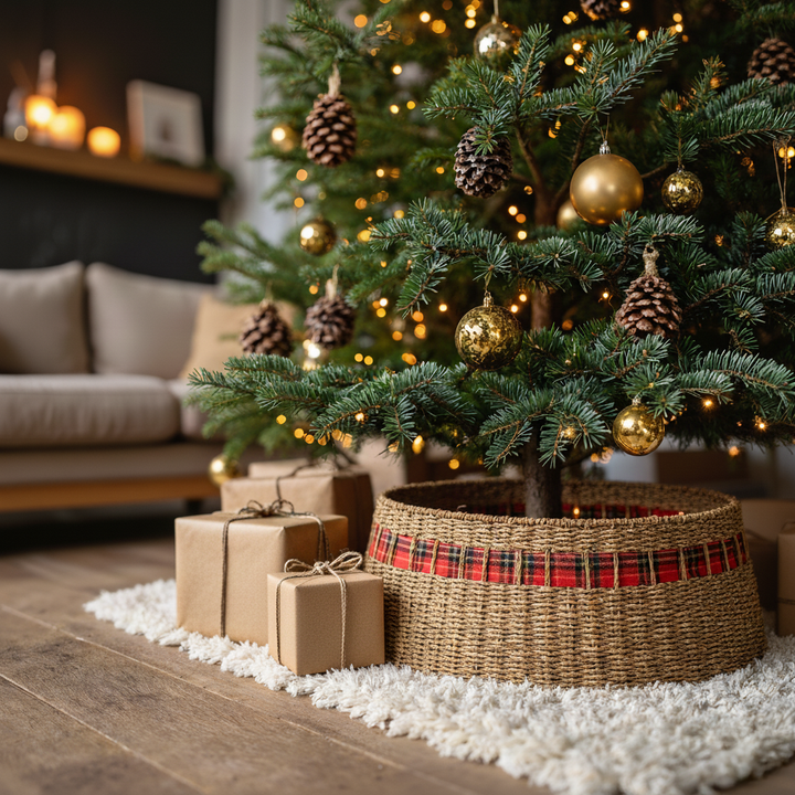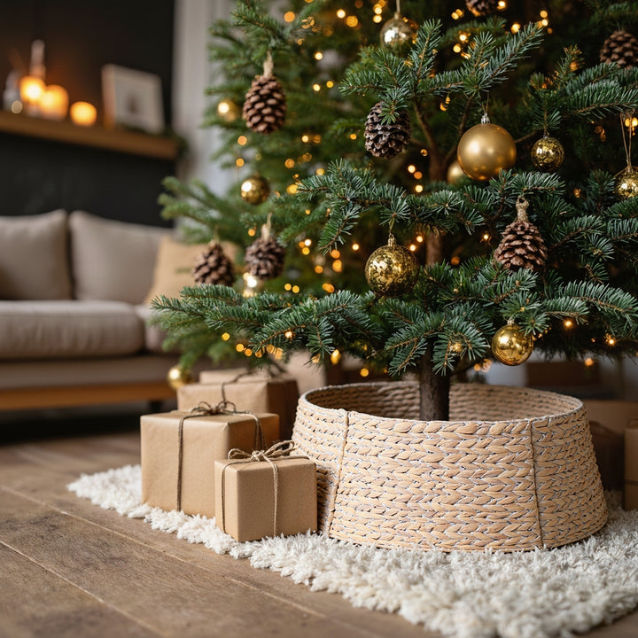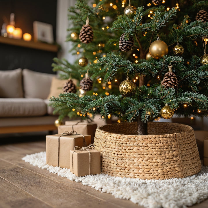 Transform your Christmas tree display with this beautifully handwoven tree collar that brings natural elegance to holiday decorating. Vietnamese artisans expertly weave water hyacinth and seagrass into a tapered collar that conceals unsightly tree stands while adding sophisticated texture to your seasonal setup. The structured design stays perfectly in place without shifting or bunching like traditional tree skirts, creating a clean, polished foundation that elevates your entire tree presentation.